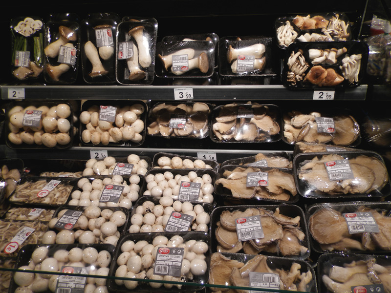 Обычно ассортимент довольно широкий. Шампиньоны, конечно, есть везде. Но также можно встретить опята, лисички, рыжики, шиитаке и еще довольно много грибов, о которых мы ничего не можем рассказать, так как просто не представляем, что это. Так что - на свой страх и риск:)