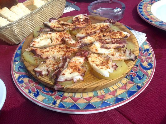 - Классика жанра - осьминог по-галисийски, он же pulpo a feira: щупальца режутся на медальоны толщиной в полсантиметра, выкладываются сверху на кусочки горячего варёного картофеля, поливаются оливковым маслом первого отжима, приправляются острой паприкой и крупной морской солью и с удовольствием съедаются.