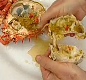- У половинки с ногами ноги удаляются (в них тоже есть мясо, добываемое при помощи щипцов), далее она разламывается пополам.