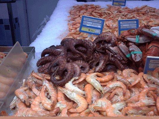 - В отличие от рыбного прилавка, морской, как правило, делится на две части: стол с сырыми свежевыловленными тварями и стол для ленивых - с тварями готовыми, умело сваренными до поступления в продажу.