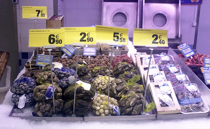 От автора сайта: не забывайте, все большинство отделов морепродуктов (как и мясных продуктов) работают по принципу номерков, а не живой очереди. Пришли, огляделись, нашли красное круглое устройство для выдачи бумажных номерков, взяли такой себе, ждете, пока загорится ваш номер на табло (хотя иногда его просто выкрикивают, тогда, если по-испански не понимаете, надо зорко поглядывать в номерки соседей, что бы не пропустить свою очередь).