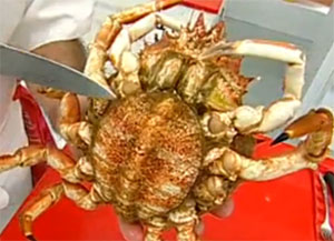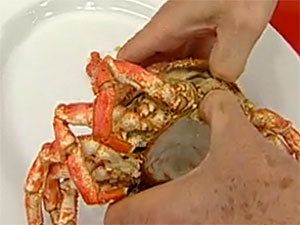 - У сваренного краба прежде всего удаляется "хвостик" у самцов и круглое отделение для икры у самок, далее в образовавшееся отверстие просовываются пальцы и краб раскрывается на две половинки. Вот так: