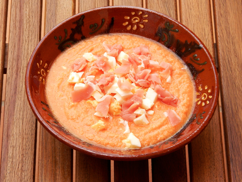 Сальморехо - еще один вариант холодного супа. Во многом напоминает гаспачо, но есть отличия - меньше компонентов (томаты, хлеб, масло, чеснок, уксус), гуще, подается обычно с хамоном и вареным яйцом. Очень вкусно и очень просто приготовить самим.