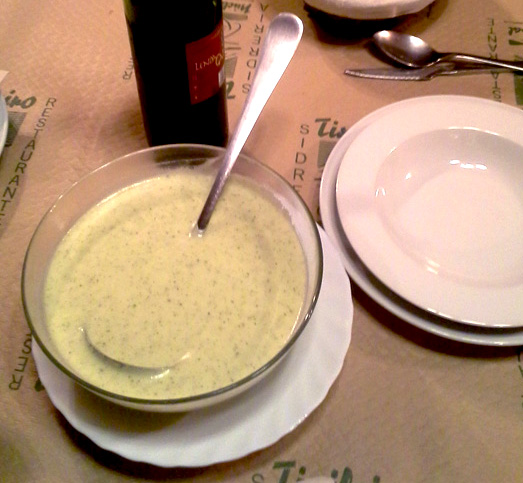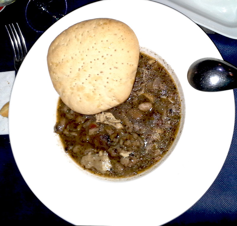 Хотя по сути это очень простой чесночный суп: мясной бульон, обжаренный хлеб (кладется уже в тарелку), красный перец, лавровый лист, чеснок, оливковое масло. Обычно подается с полусырым яйцом, который вбивается в суп в последний момент, схватывается сверху и остается сырым внутри.