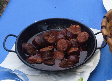 Чорисо в сидре/chorizo a la cidra - острые колбаски, тушеные в сидре. Кислый классический сидр удачно компенсирует жирность колбасок. Подается с белым хлебом, и макать его в остающийся соус - особое удовольствие!