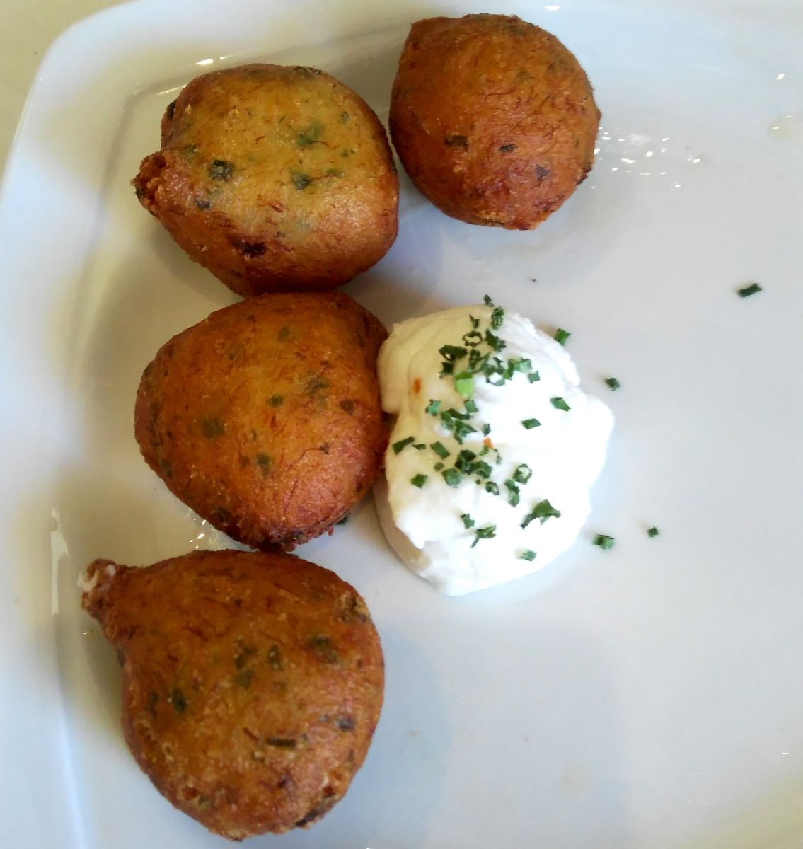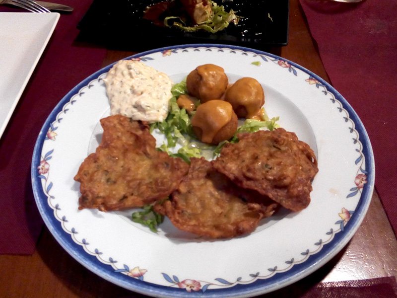 Tortitas de camarón (тортитас де камарон) - типичная андалузская (с юга Испании) закуска: жаренные оладушки с крилем (микроскопическими креветками размером не более 1 см). На фото - с салатом и крокетами. В зоне Аликанте можно найти в андалузких барах, которые довольно нетрудно опознать по соответствующему колориту: музыка фламенко, фото и афиши корриды.