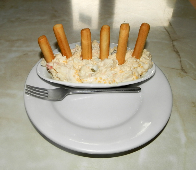 Русский салат/ensaladilla rusa - ближайший аналог оливье, но обычно с тунцом вместо мяса. Вкусненько, но ни разу не диетично: майонеза бухают, не жалея. Обычно подается с воткнутыми в него палочками или крендельками из постного хрустящего теста (что-то вроде сушек, но помягче).