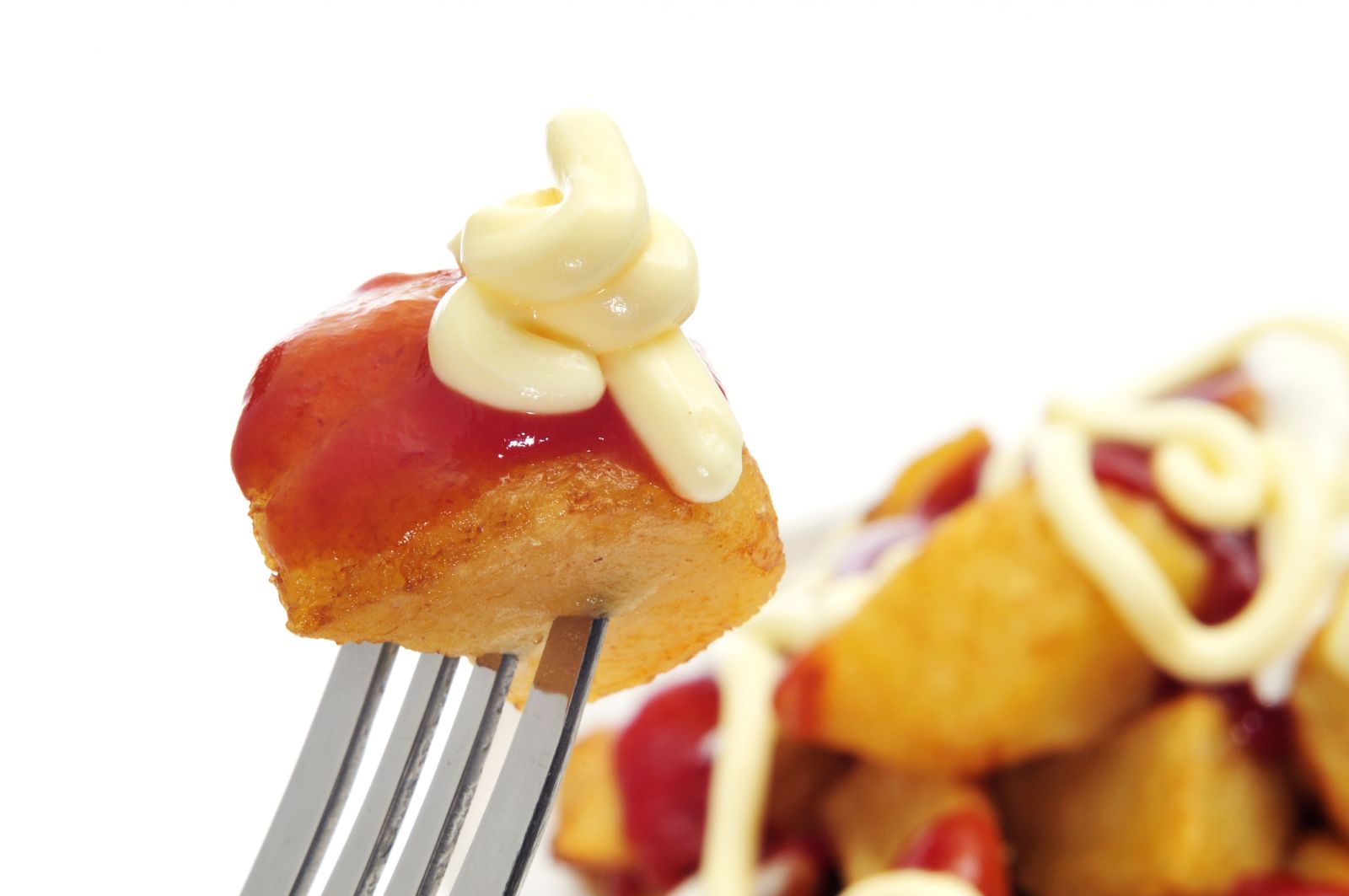 Пататас бравас/patats bravas - "храбрая картошка":) Жареный картофель с двумя соусами: красный томатный и белый чесночный. Иногда в туристических местах халтурят и заменяют соусы кетчупом и майонезом, но это уже точно не классическая пататас бравас.