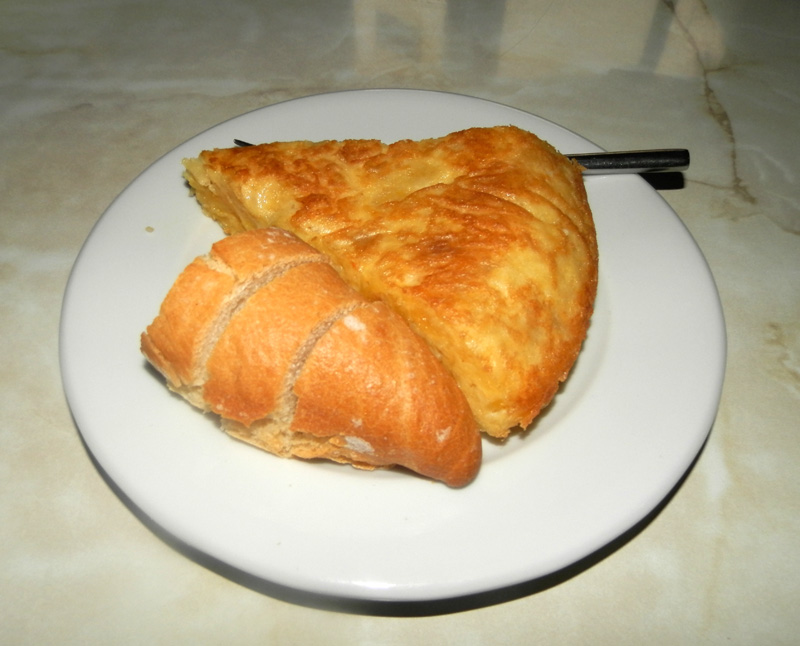 Тортилья/tortilla - по сути это картофельный омлет: лепешка, которая в классическом варианте готовится из обжаренной картошки и лука, залитыми смесью яиц. Кроме классического варианта, бывает тортилья с наполнителями: с паприкой, со шпинатом, с чоризо (острые колбаски). Подается обычно с багетом. Существует довольно популярный бутерброд (bocadillo) из разрезанного вдоль багета с вложенной внутрь тортильей, странноватая штука!:)
