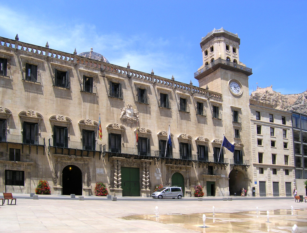 Мэрия расположена в самом центре города, недалеко от набережной и пляжа, обозначена на любой карте словом Ayuntamiento. Сама площадь - очень красивое место: живописный, украшенный цветами фасад входа (фасад датируется XVIII веком, создан испанским архитектором Лоренсо Чапули в стиле барокко), массивные железные двери, башня с часами, из-за которой выглядывает силуэт горы с замком Санта-Барбара, балкончики окрестных жилых домов, тоже все в цветах.
