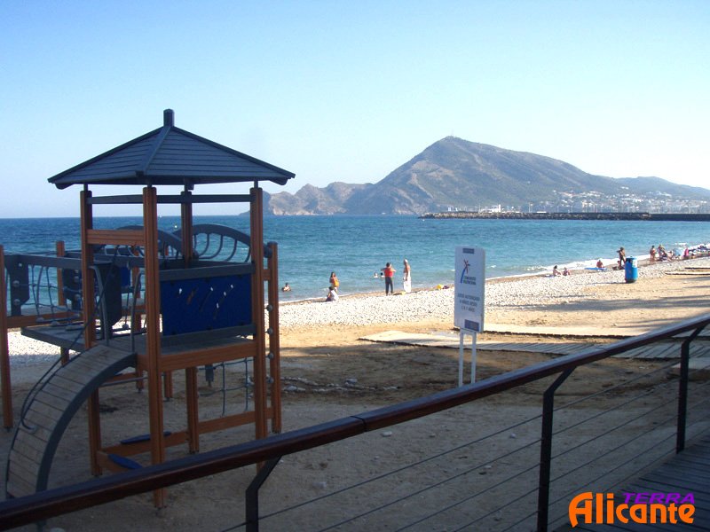 Пляж (галька, песок), длиной 1400 метров и средней шириной 20 метров,отмечен «знаком качества», т.н. голубым флагом, служащим гарантией безопасности и соответствия стандартам. Городской, от центра в сторону Кальпе.