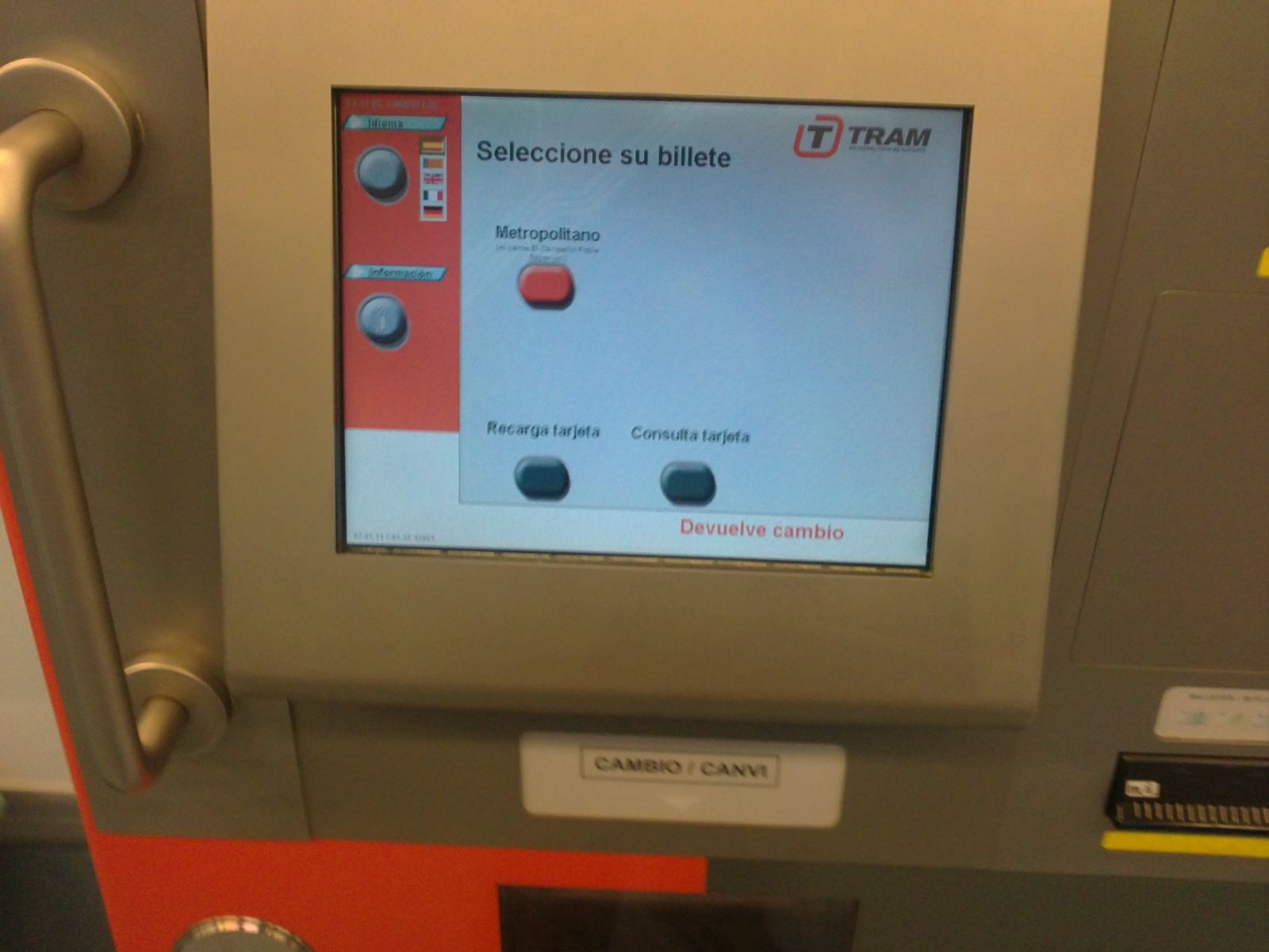 Управление очень простое: для поездки в пределах зоны А, то есть до El Campello, Venta Lanuza (подробнее о зонах и станциях см. Трамваи), нужно выбрать кнопку "метрополитен" (созвучно на всех языках, узнаваемо). Две другие кнопки - пополнить баланс карты или проверить остаток на карте.