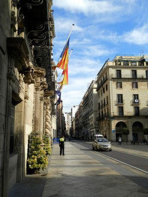 Что же мы видим? Витые колонны, окна и балконы с коваными решетками, большой герб города по центру, 2 башни авторства архитектора Лоренцо Чапули, тяжелые металлические двери, 4 флага: валенсийский, испанский, флаг города и последний - Евросоюза.