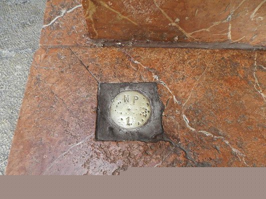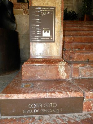 Во-первых, в первую ступеньку вмонтирован металлический блинчик с цифрой 1 - это точка отчета уровня моря по всей Испании (по-испански называется "cota cero"), все геодезические расчеты высот идут далее от нее. Рядом установлена табличка, которая сообщает нам, что данная точка имеет высоту 3, 4095 м над реальным уровнем моря.