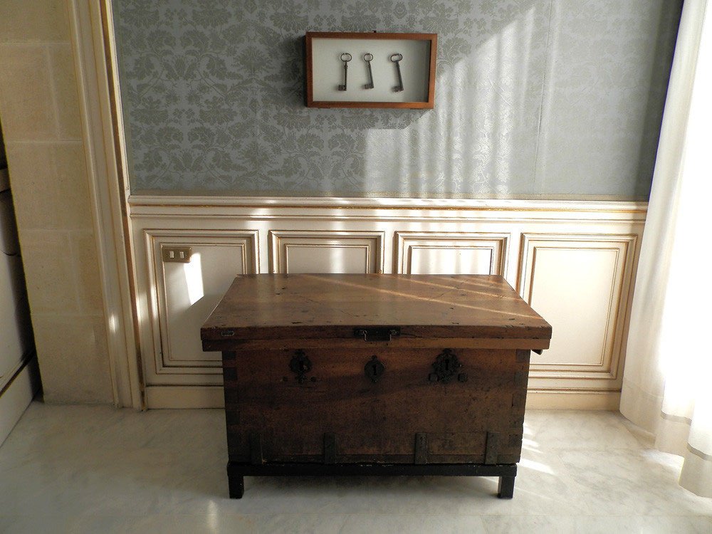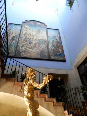 В этом же зале есть еще один любопытных экспонат, это "Сейф Трех Ключей" - огромный старинный сундук, над которым в рамочке висят те самые "три ключа", явным образом перекликающиеся с тремя замочными скважинами в самом сундуке. Этому "сейфу" уже более 600 лет, он был изготовлен в 1500 году и изначально хранился еще в прежней мэрии, разрушенной французами. Именно в нем лежали все самые важные документы города, а ключи хранили у себя мэр, один из членов городского совета и судебный секретарь. Соответственно, открыть сундук они могли, лишь собравшись все вместе. Такова была обязательная к выполнению норма для городов Испании того времени.