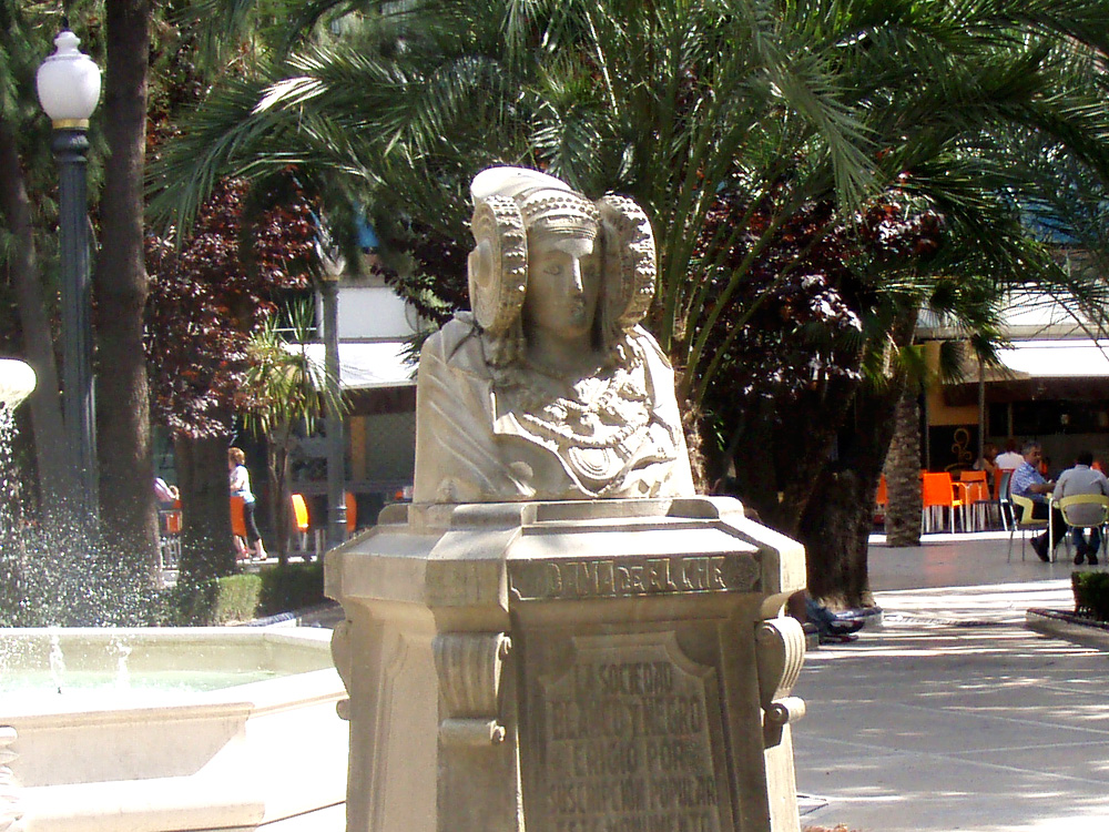 Примерно в это же время создают знаменитую Даму Эльче (Dama de Elche) – каменную скульптуру в виде бюста девушки-священника высотой 56 сантиметров и весом 65 килограммов. С тыльной стороны бюста имеется отверстие диаметром 18 см и шириной 16 см. Считается, что оно служило для хранения реликвий, священных предметов или пепла, как подношения усопшему. Скульптуру нашли случайно 4 августа 1897 года и сначала не поняли ее истинной ценности, зато у всей деревни появилась общая тема для разговоров. В августе того же года Даму Эльче продали французу за 4.000 франков – бешеные деньги по тем временам, и в течение 40 следующих лет она выставлялась в Лувре. Лишь после начала Второй мировой войны, Испания смогла вернуть историческую ценность на родину и до 1971 года добросовестно хранила реликвию в Музее Прадо в Мадриде. Какое-то время скульптура выставлялась в Археологическом музее родного города – Эльче, в настоящий же момент каменную Даму-путешественницу можно увидеть в Национальном Археологическом музее, расположенном в Мадриде.