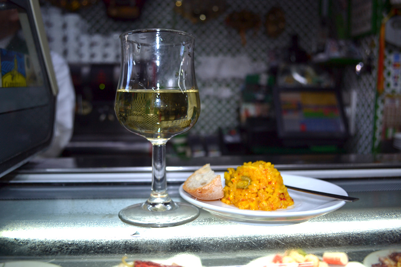 Во избежание сюрпризов для кошелька, лучше не заказывать там еду, но зато совершенно неразорительно взять рюмку белого сухого вина “Barbadillo” из андалусского Санлукара. Казалось бы, абсолютно туристическое место на облюбованной туристами площади. Но нет, пространство у стойки забито испанцами, а в иной день там можно столкнуться лицом к лицу с живым классиком Артуро Пересом-Реверте, который, как легко догадаться, абы куда не ходит. Зимой к напитку подадут горячий бульон, а летом - холодный гаспачо.