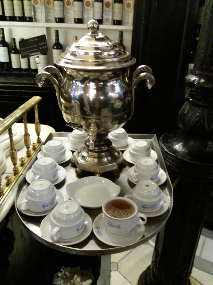 Но всякий мадридец заходит в “Ларди” даже не за выпечкой, а за горячим консоме… из настоящего русского самовара! Да-да, в глубине прихожей стоит натуральным самовар с огнедышащим бульоном во чреве. Любой желающий может самостоятельно налить из него в чашку бульона, что особенно актуально в иной промозглый день, и расплатиться на выходе. В отличие от порядка цен на основные блюда, цены в “прихожей” очень умеренны.