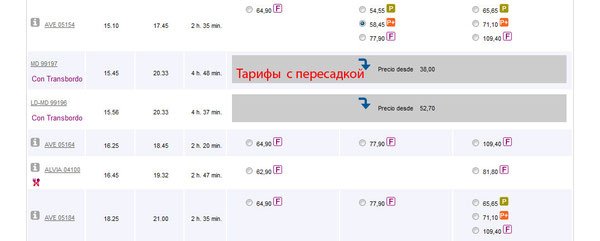 Если видите вот такое непонятное обозначение - серый квадрат со стрелочкой и надписью со словом "desde" ("от") и ценой - это почти всегда поезд с пересадкой (в этом случае должна быть надпись "con transbordo"). Если такой вариант тоже рассматривается (но обратите внимание на столбик времени в пути) - жмите, раскроется подменю. Обычно по таким вариантам предлагается только тариф"Flexible".