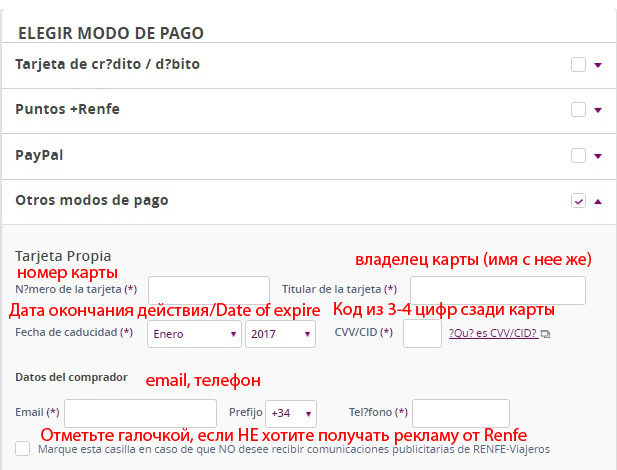 Теперь вы можете выбрать детский тариф "Niño" (для детей 4-13 лет). из выпадающего меню "Tarifas y Descuentos disponibles" Обратите внимание, детский билет может стоить дороже, чем билет, выбранный вами ранее. В описании тарифов вы могли прочесть, что детский тариф имеет скидку от базового тарифа 40%, а тарифы «Промо» и «Промо » - 70% и 65% соответственно. Они не суммируются, так что смотрите по ценам, что вам выгоднее.