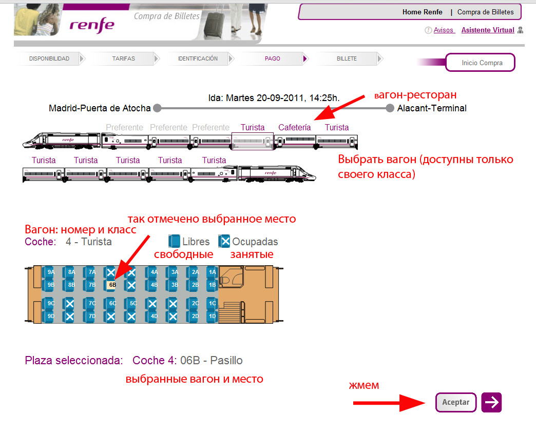 - Preferente - это аналог бизнес-класса самолета. Более комфортные сидения, на больших расстояниях (например, Мадрид или Барселона- Аликанте) включено питание.