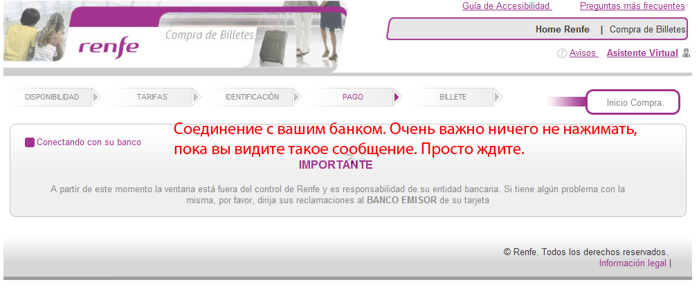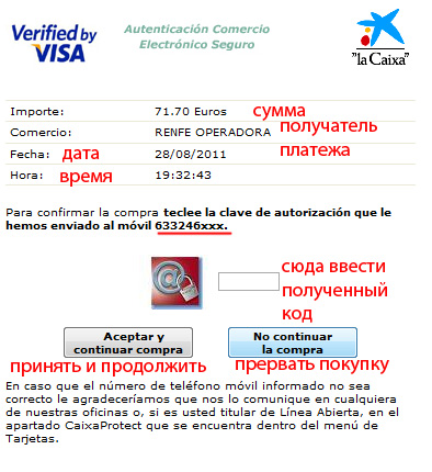 Когда код введен, жмите левую кнопку - "aceptar y continuar compra" ("принять и продолжить покупку"). Правая - "no continuar la compra" ("не продолжать покупку")
