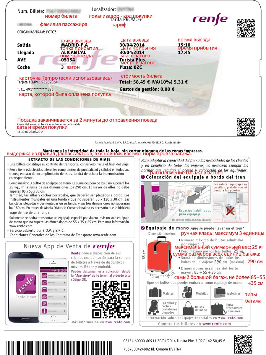 - класс вагона: туристический (turista), туристический плюс (turista +) или первый (preferente) .