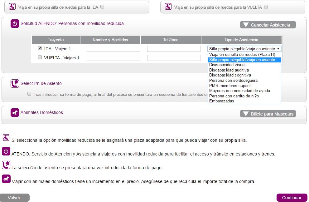 - Solicitud atendo - запрос доп. помощи при путешествии с пассажиром в инвалидной коляске или с подобными специфическими условиями.