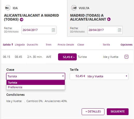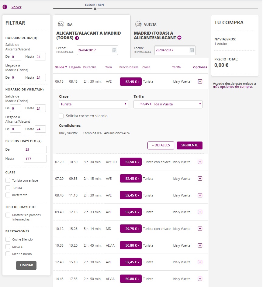 Можно слева задать дополнительные фильтры: временной промежуток поездки туда (Ida) и обратно (vuelta), цену от и до, класс вагона (туристический, turista, или первый, preferente. Фигурирует еще turista con enlace - это с пересадкой).