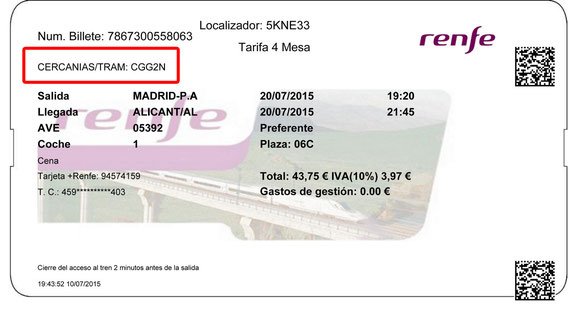 - Код cercanias/tram, размещенный на билете, генерируется автоматически при его покупке и действует максимум на 2 поездки (одна до поезда и вторая - после) на 1 человека.